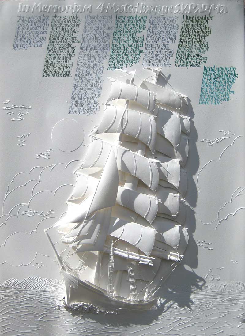 Paper sculpture original calligraphy art for a client whose mother had written many poems during her many solo voyages. The calligraphy is written in gouache with hand embossing and feathering to complete this major paper sculpture calligraphy design. This work is $3500
