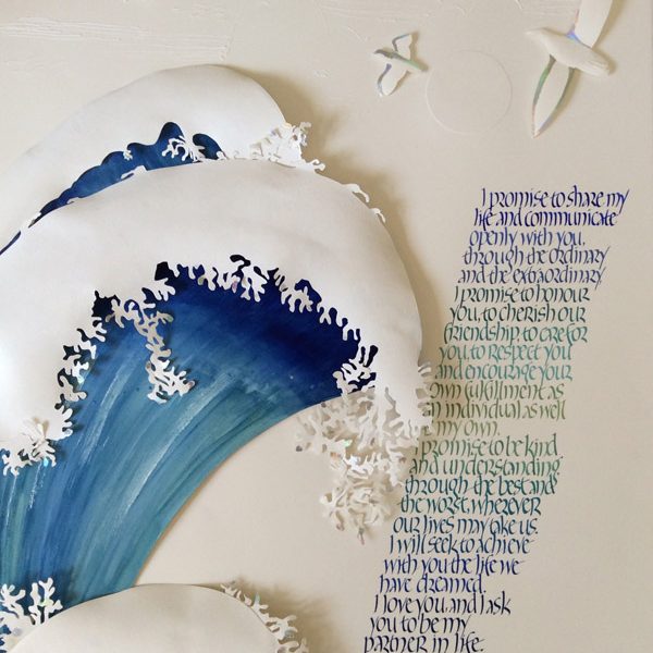 Parma Paper sculpture original calligraphy art for a client whose mother had written many poems during her many solo voyages. The calligraphy is written in gouache with hand embossing and feathering to complete this major paper sculpture calligraphy design. This work is $3500